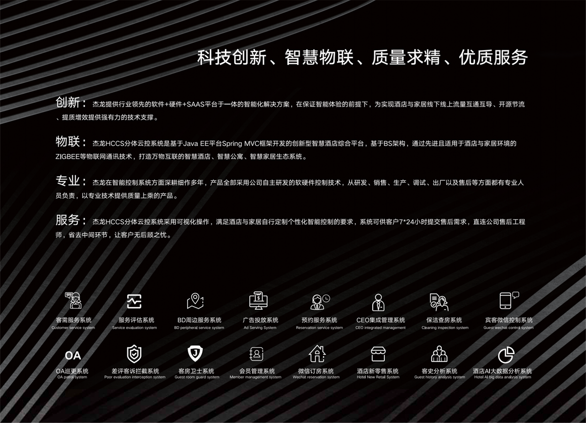 多年来公司坚持“科技创新,客户至上,技术领先,质量求精,优质服务”的经营方针,与时俱进,秉承“智能化、人性化”的管理理念,专注于“智能控制产品”的研发;在产品链上实现了标准模块化,根据项目需求只需进行简单的模块配置便可实现各种酒店以及家居服务的个性化控制。