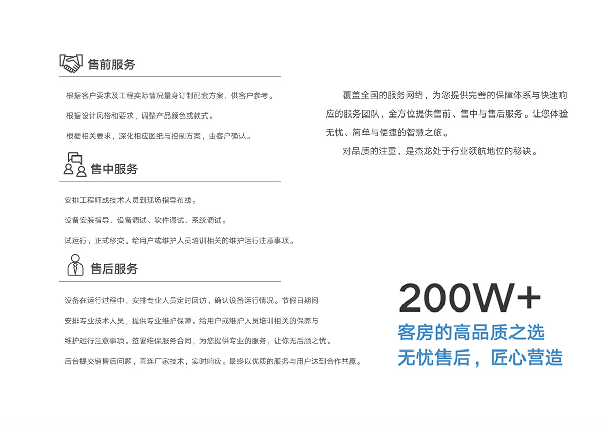 其产品全部采用公司自主研发的控制技术,把智能逻辑控制与人性化控制完美结合,打造一个全新的数字智能企业,为企业提升品质、节约能耗、提高服务效率、节省人力成本。有战略才有将来,杰龙先创将以战略的眼光来谋划发展核心方向,历经13年的发展,以及在广大客户的支持下,我们已经成为中国地区酒店节能控制行业及酒店综合方案设计行业的领跑者。